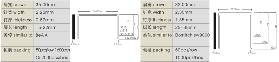 The company is equiped with the auto nail assemble line made in Taiwan and advanced single-line nail machine ;The wire is made of quauty galvanized steel wire,copperized iron wire , stainless steel wire and aluminum steel wire . The products cover the full range of fine wire staples , heavy wire staples , carton staples , special - shaped staples , hog-ring & omega staples , headless pins , brad nails , paper clips , wire band , wire steel . we has won thumb-up from mass customers from inside China and abroad thank to good quality ……